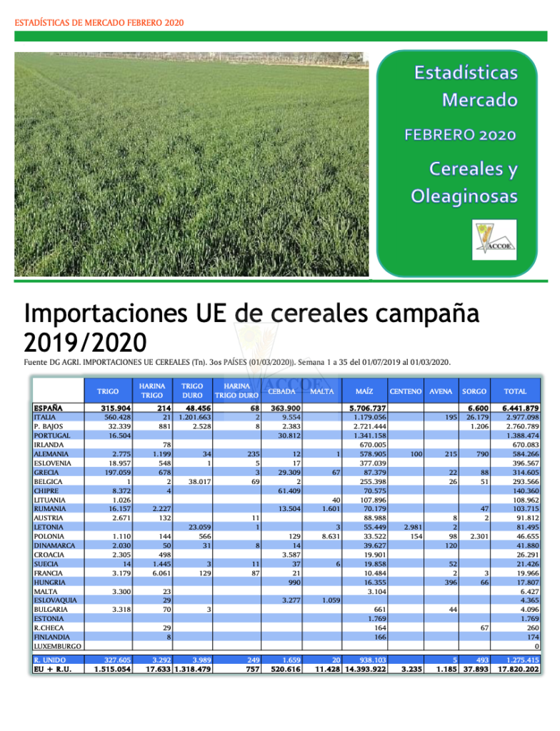 ACCOE analiza en el siguiente pdf descargable todas las estadísticas del mercado de cereales, tanto de importaciones y exportaciones como de los precios del mercado nacional. Puede acceder al informe y descargarlo en pdf tocando en la imagen.