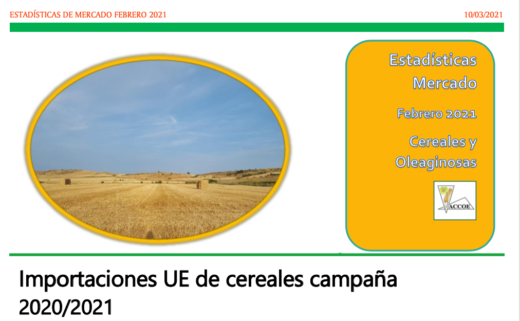 ACCOE analiza en el siguiente pdf descargable todas las estadísticas del mercado de cereales, tanto de importaciones y exportaciones como de los precios del mercado nacional de la campaña en Febrero de 2021. Puede acceder al informe y descargarlo en pdf tocando en la imagen.